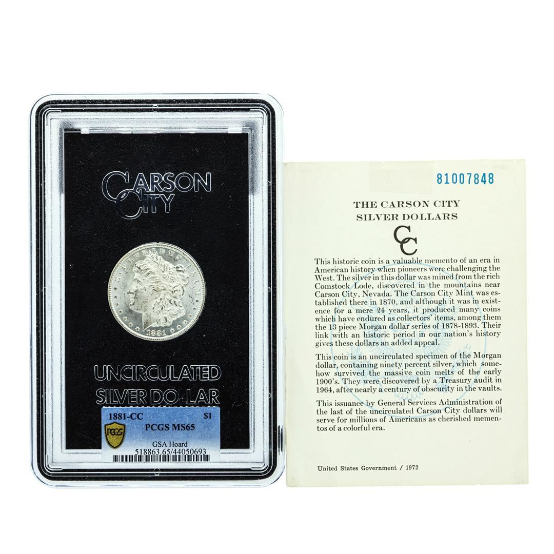 One 1881-CC $1 Morgan Silver Dollar Coin PCGS MS65 GSA Hoard w/COA.
