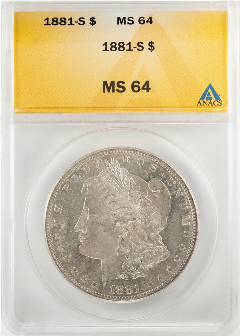 One 1881-S $1 Morgan Silver Dollar Coin ANACS MS64. ANACS Certified.
