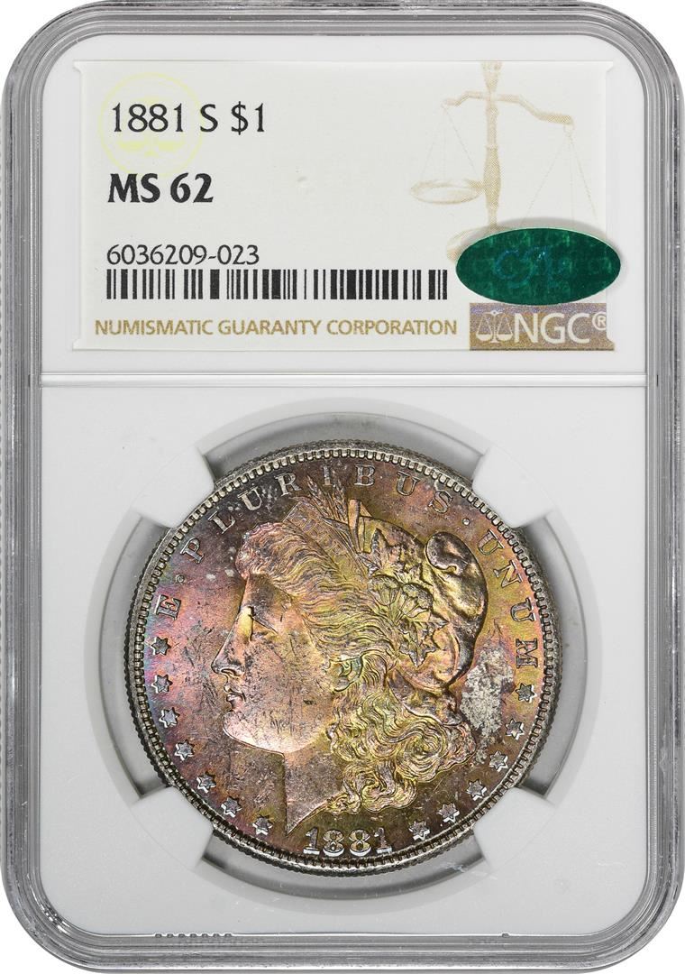 1881-S $1 Morgan Silver Dollar Coin NGC MS62 CAC Amazing Toning