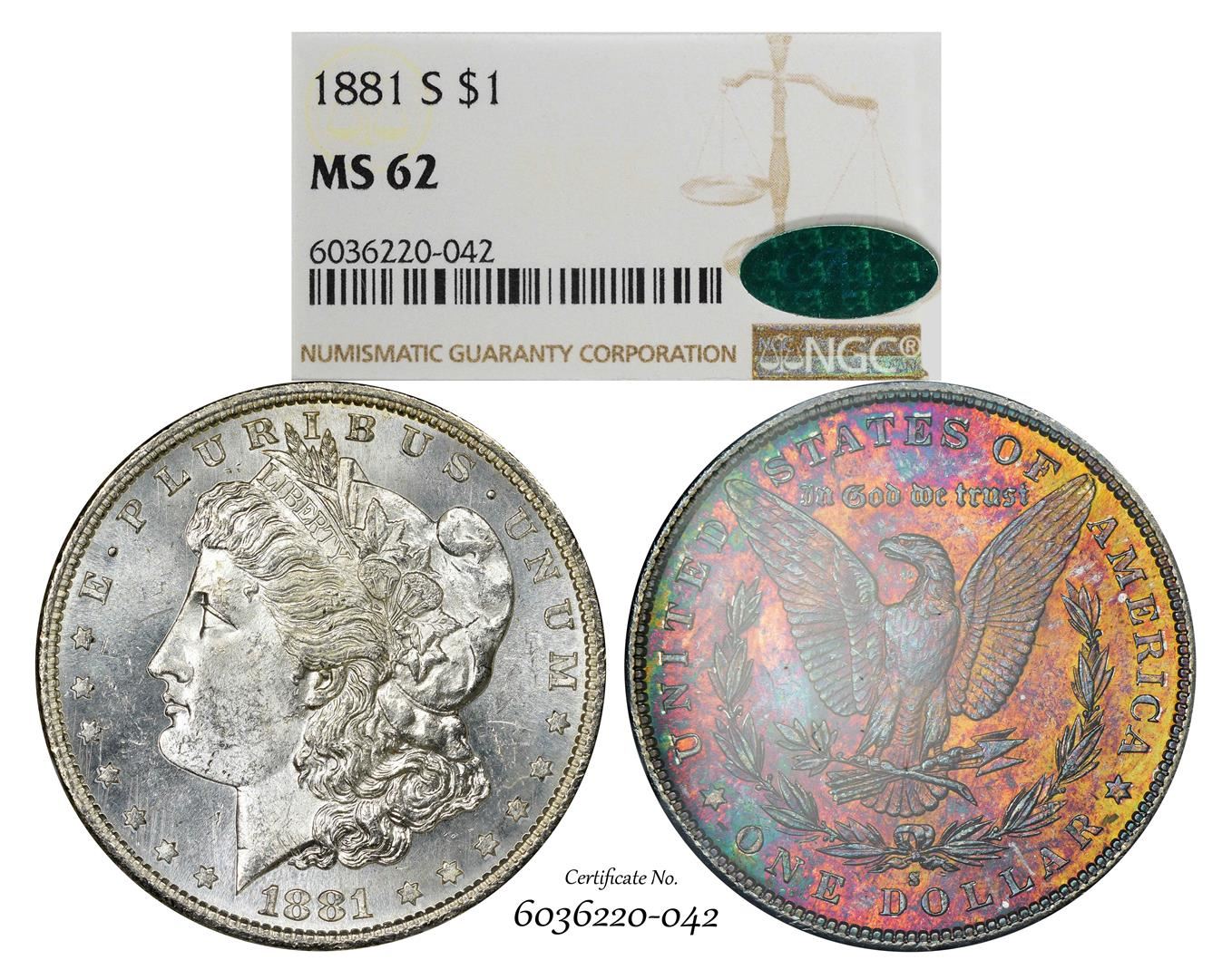 1881-S $1 Morgan Silver Dollar Coin NGC MS62 CAC Amazing Toning