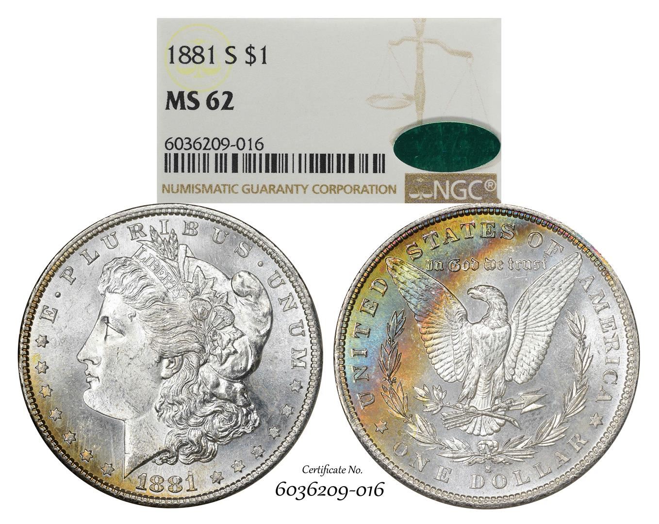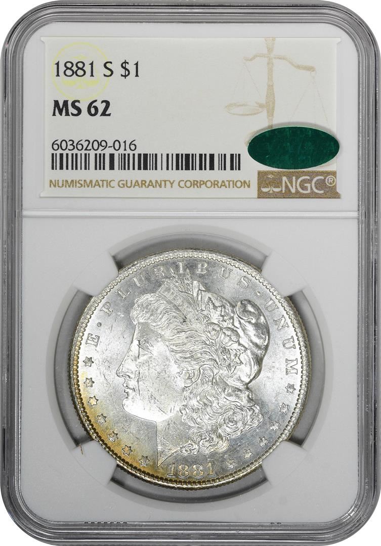 1881-S $1 Morgan Silver Dollar Coin NGC MS62 CAC Amazing Toning