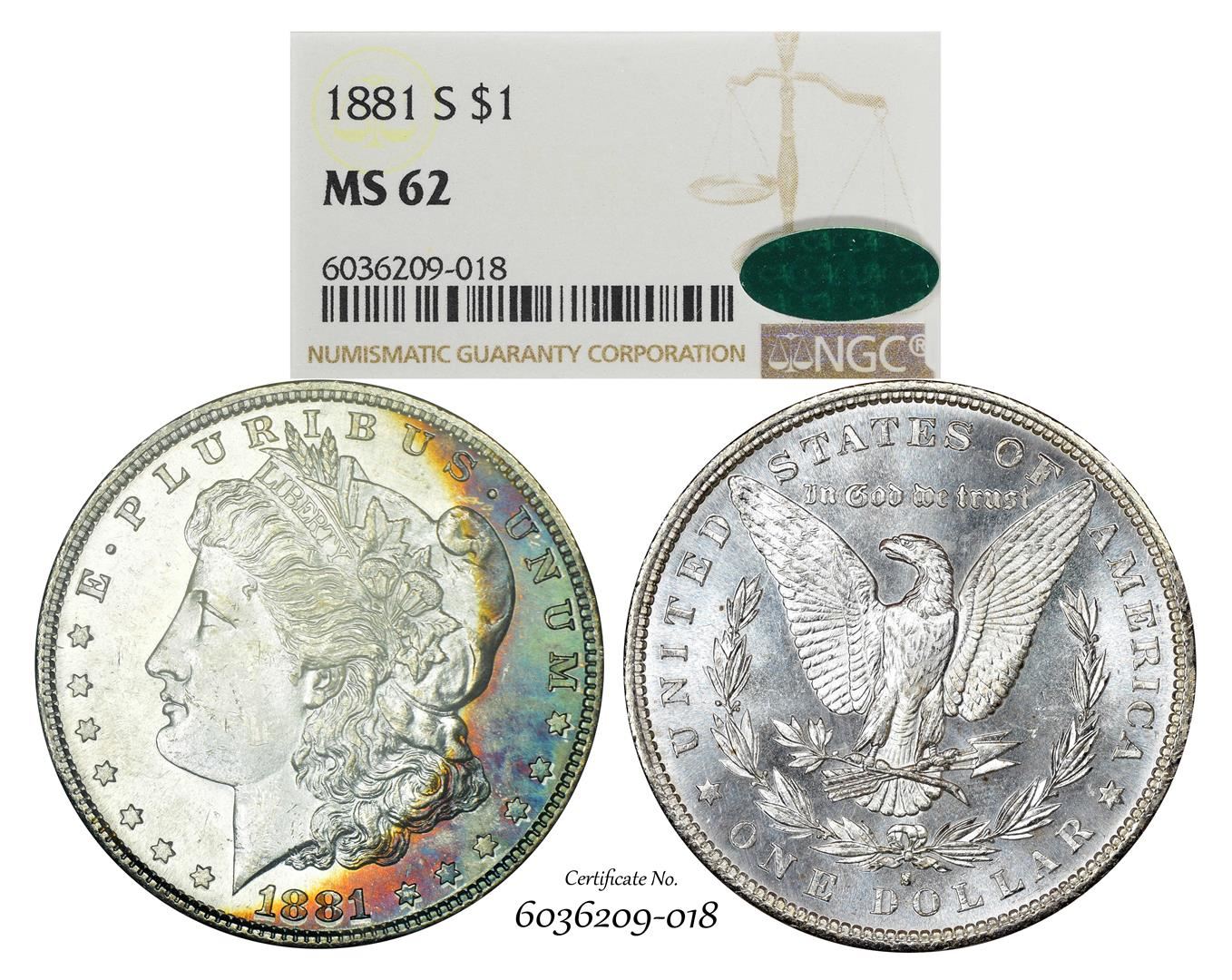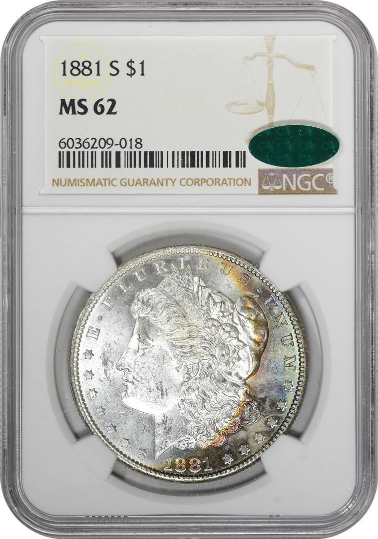 1881-S $1 Morgan Silver Dollar Coin NGC MS62 CAC Amazing Toning