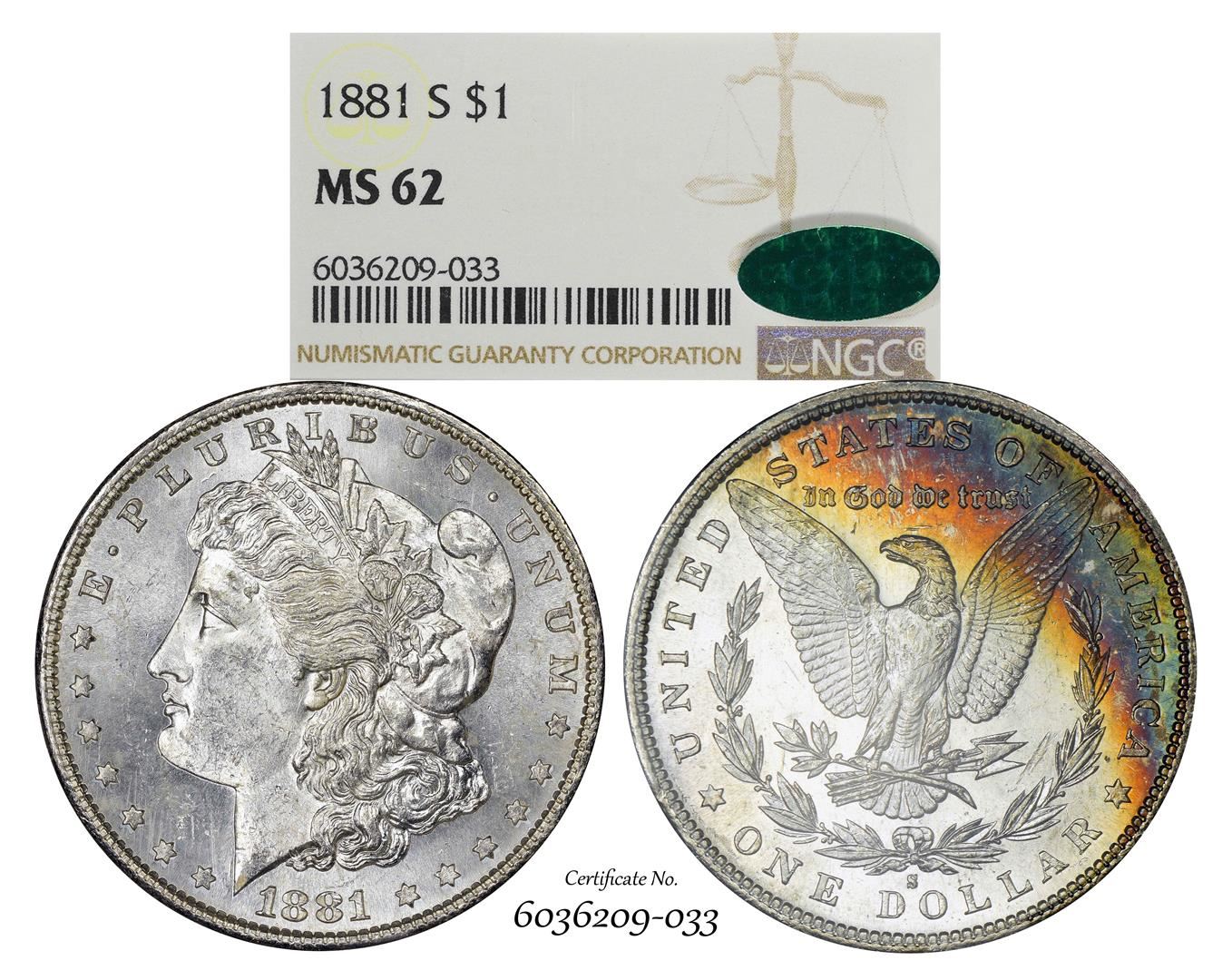 1881-S $1 Morgan Silver Dollar Coin NGC MS62 CAC Amazing Toning