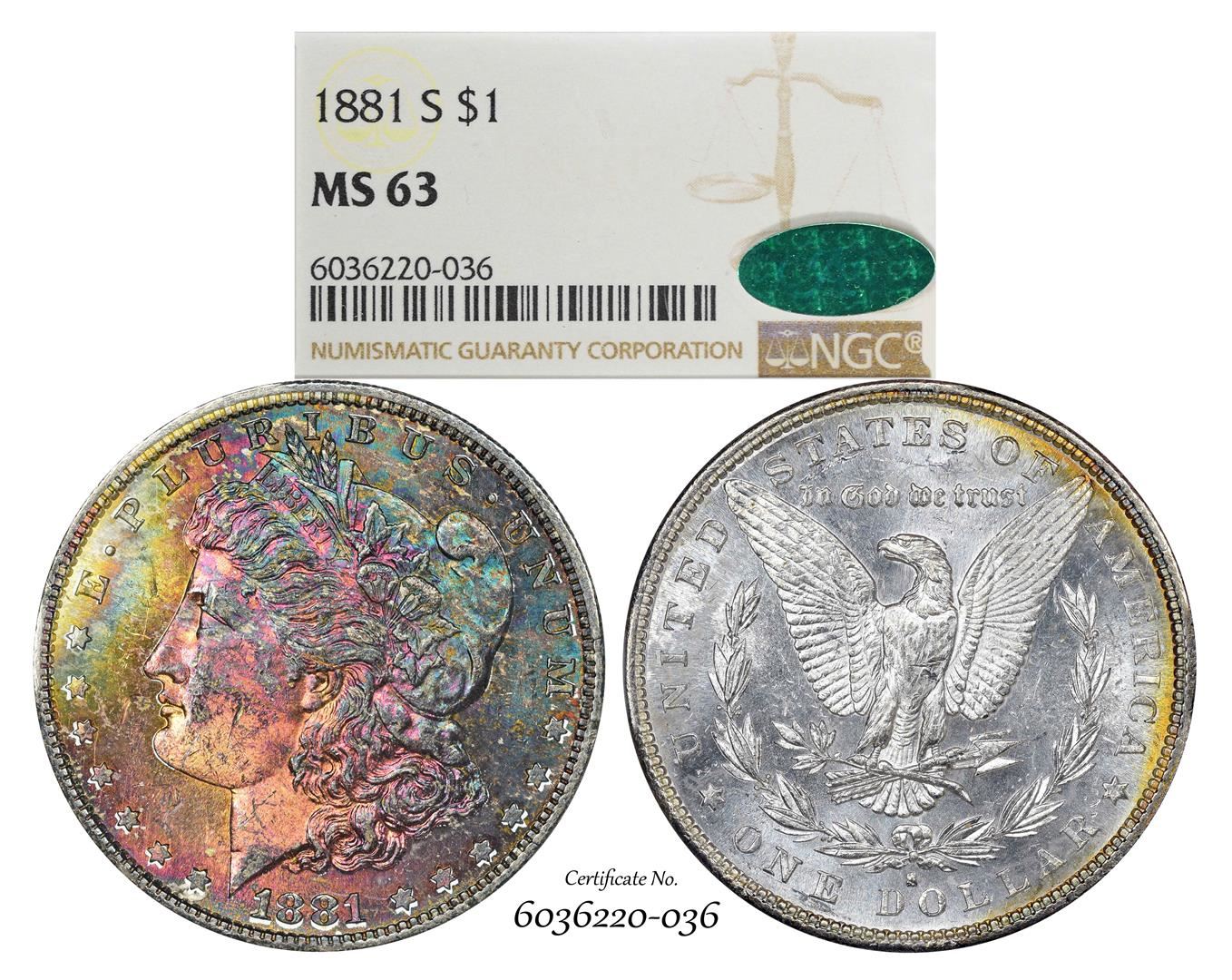 1881-S $1 Morgan Silver Dollar Coin NGC MS63 CAC Amazing Toning