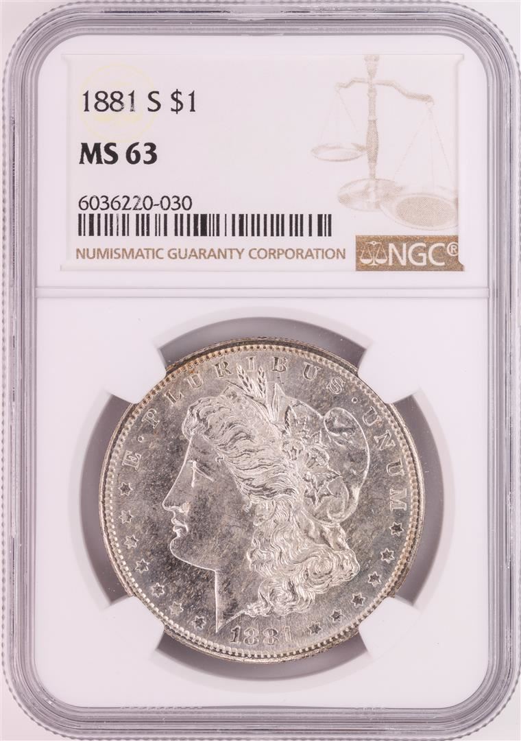 One 1881-S $1 Morgan Silver Dollar Coin NGC MS63 Great Toning. NGC Certified.