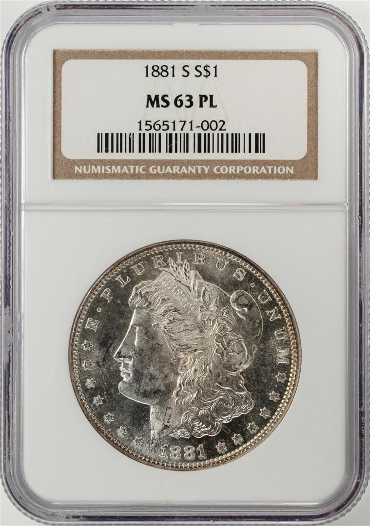 One 1881-S $1 Morgan Silver Dollar Coin NGC MS63 PL. NGC Certified.