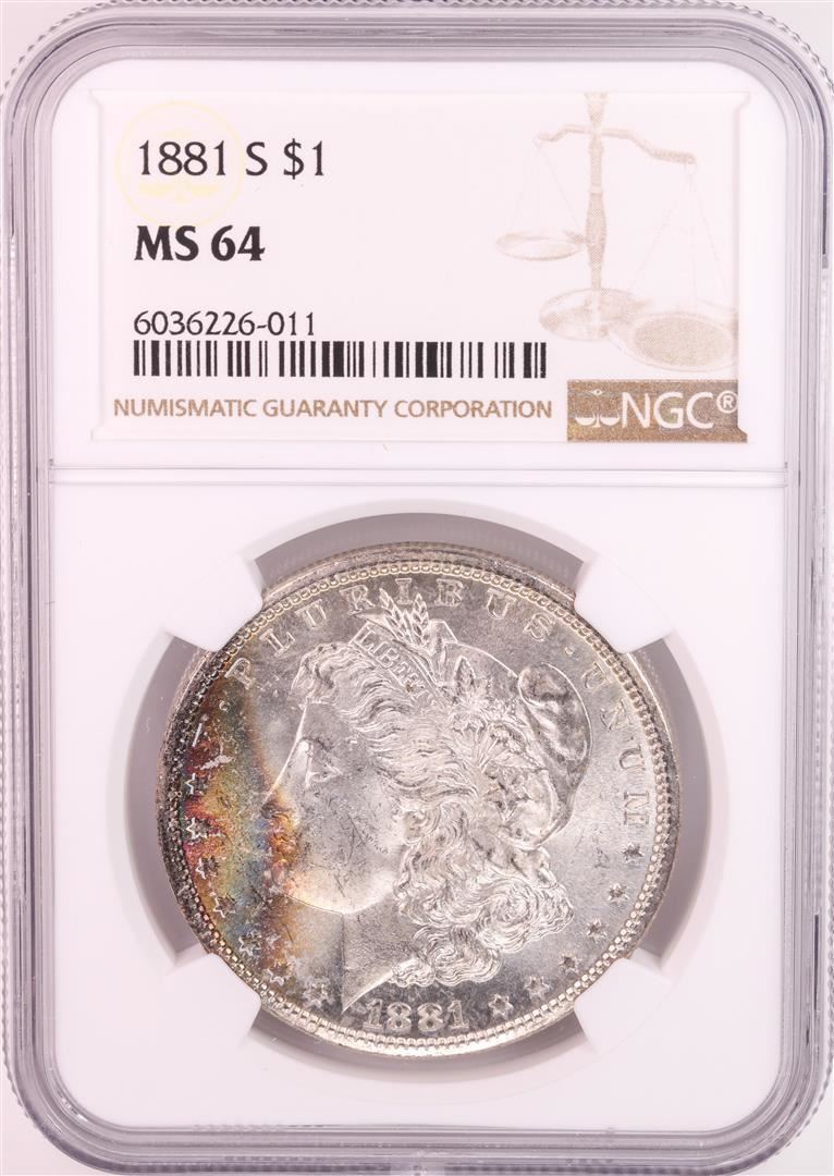 One 1881-S $1 Morgan Silver Dollar Coin NGC MS64 Great Toning. NGC Certified.