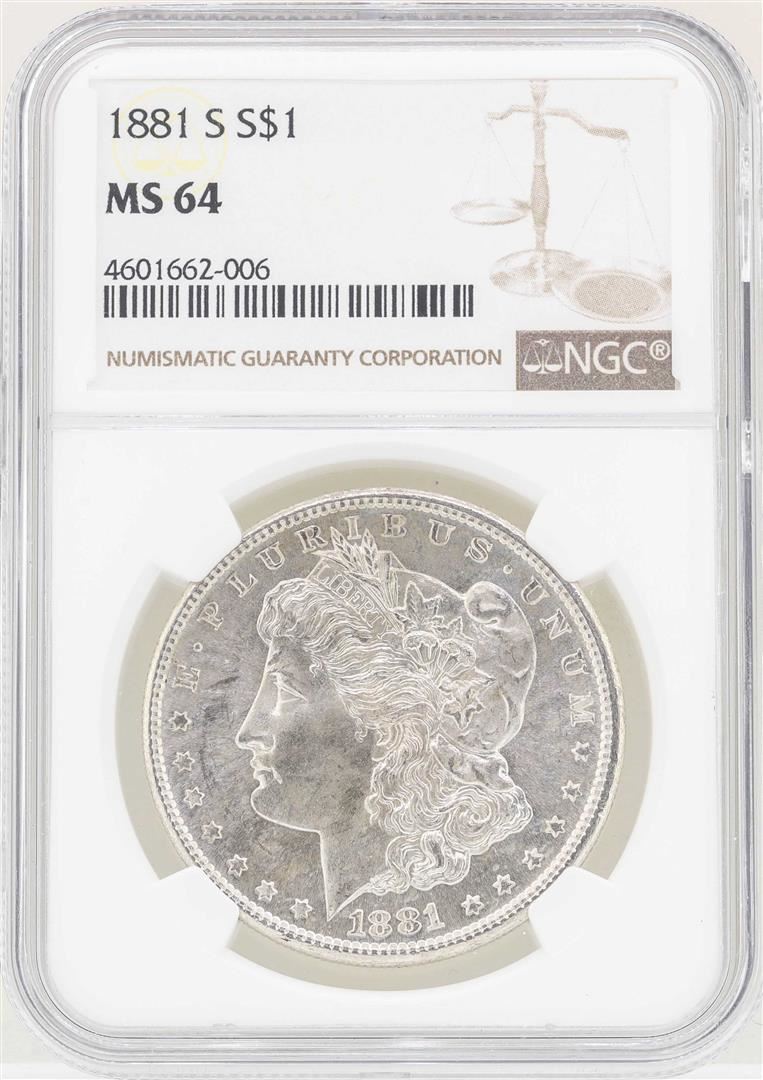 One 1881-S $1 Morgan Silver Dollar Coin NGC MS64. NGC Certified.