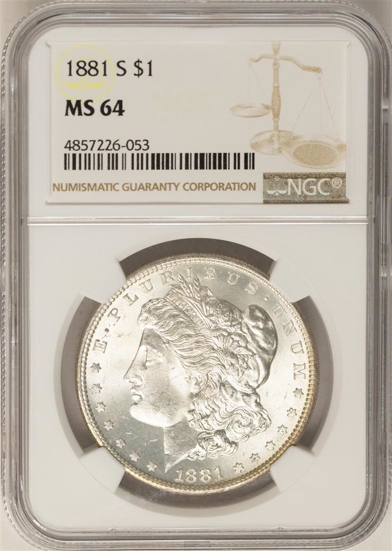 One 1881-S $1 Morgan Silver Dollar Coin NGC MS64. NGC Certified.