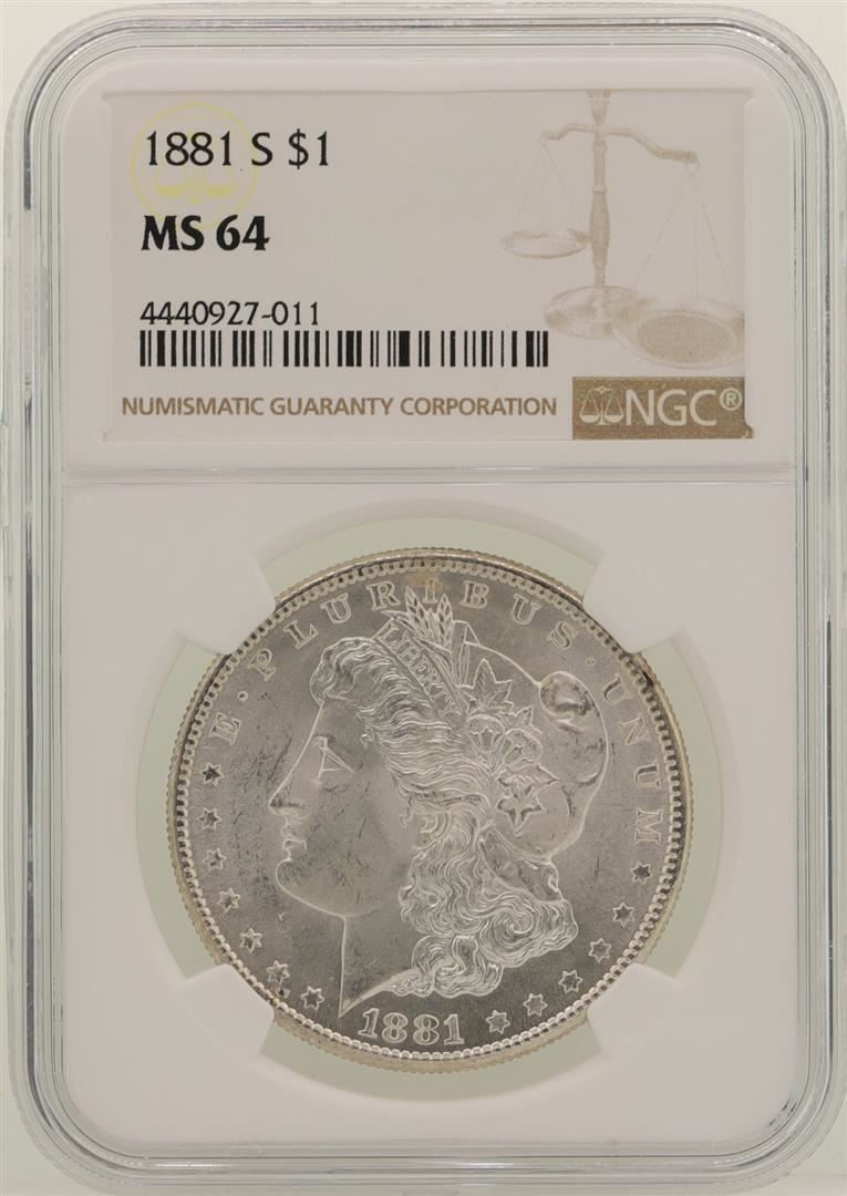One 1881-S $1 Morgan Silver Dollar Coin NGC MS64. NGC Certified.