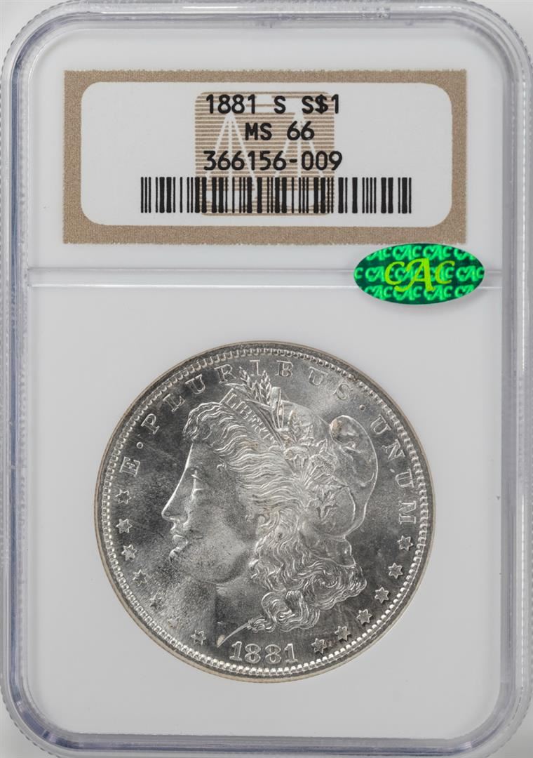 One 1881-S $1 Morgan Silver Dollar Coin NGC MS66 CAC. NGC Certified.