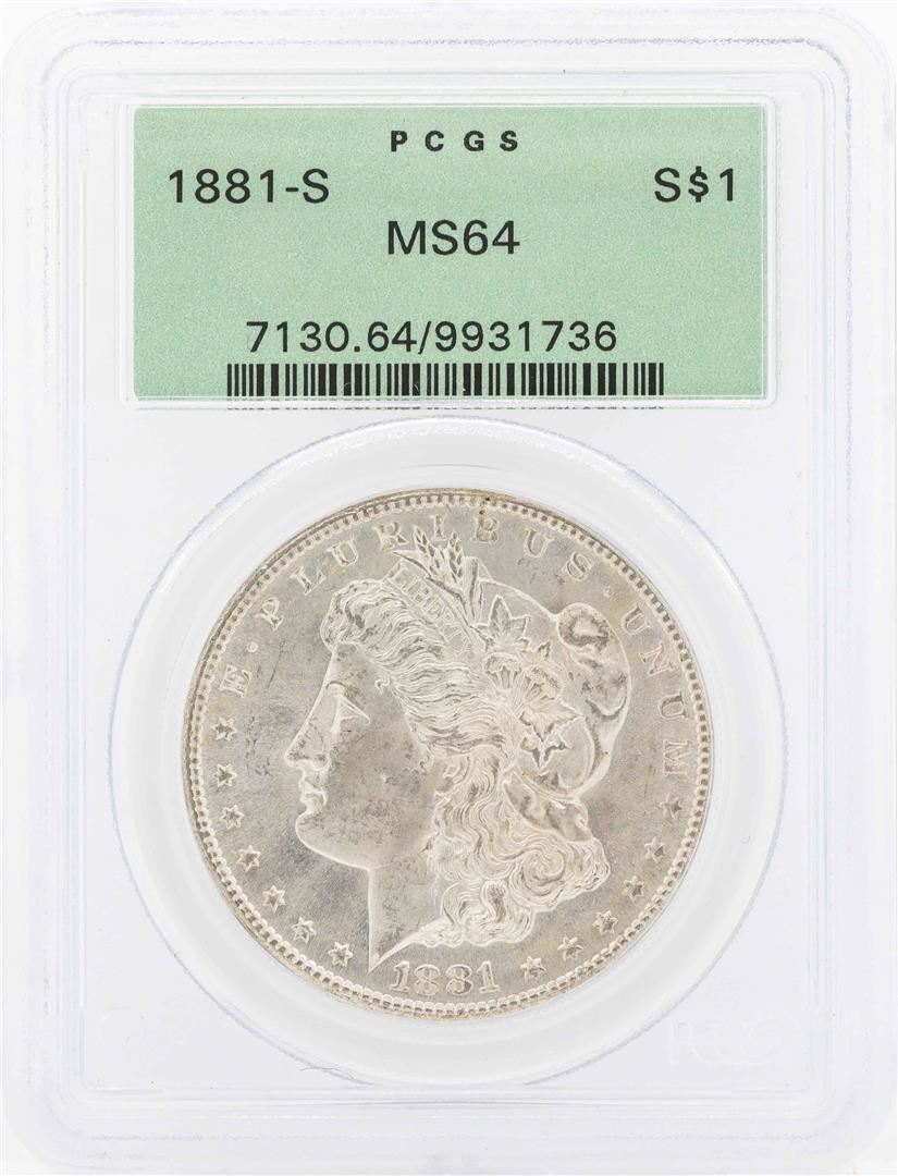 One 1881-S $1 Morgan Silver Dollar Coin PCGS MS64. PCGS Graded.