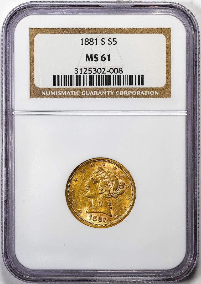One 1881-S $5 Liberty Head Half Eagle Gold Coin NGC MS61. NGC Certified.
