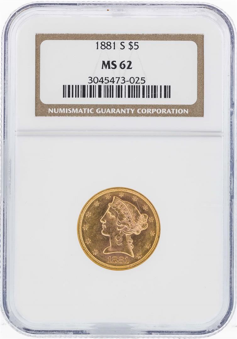 One 1881-S $5 Liberty Head Half Eagle Gold Coin NGC MS62. NGC Certified.