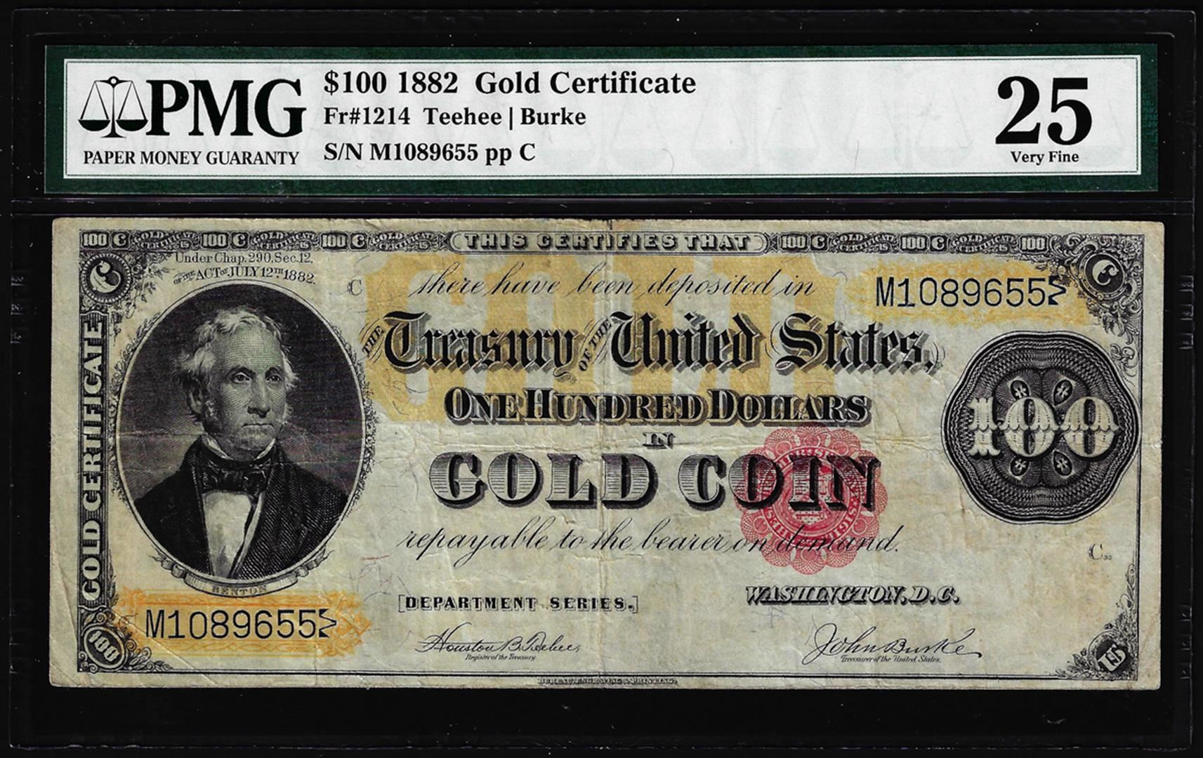 1882 $100 Gold Certificate Note Fr.1214 PMG Very Fine 25