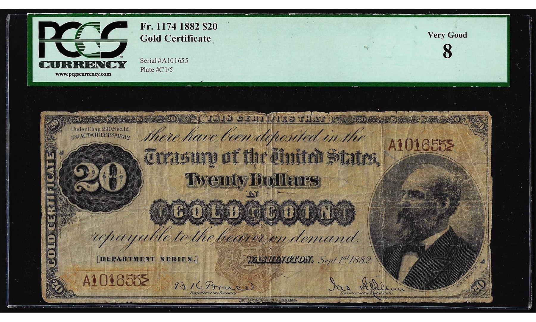 One 1882 $20 Gold Certificate Note Fr.1174 PCGS Very Good 8. PCGS Graded.