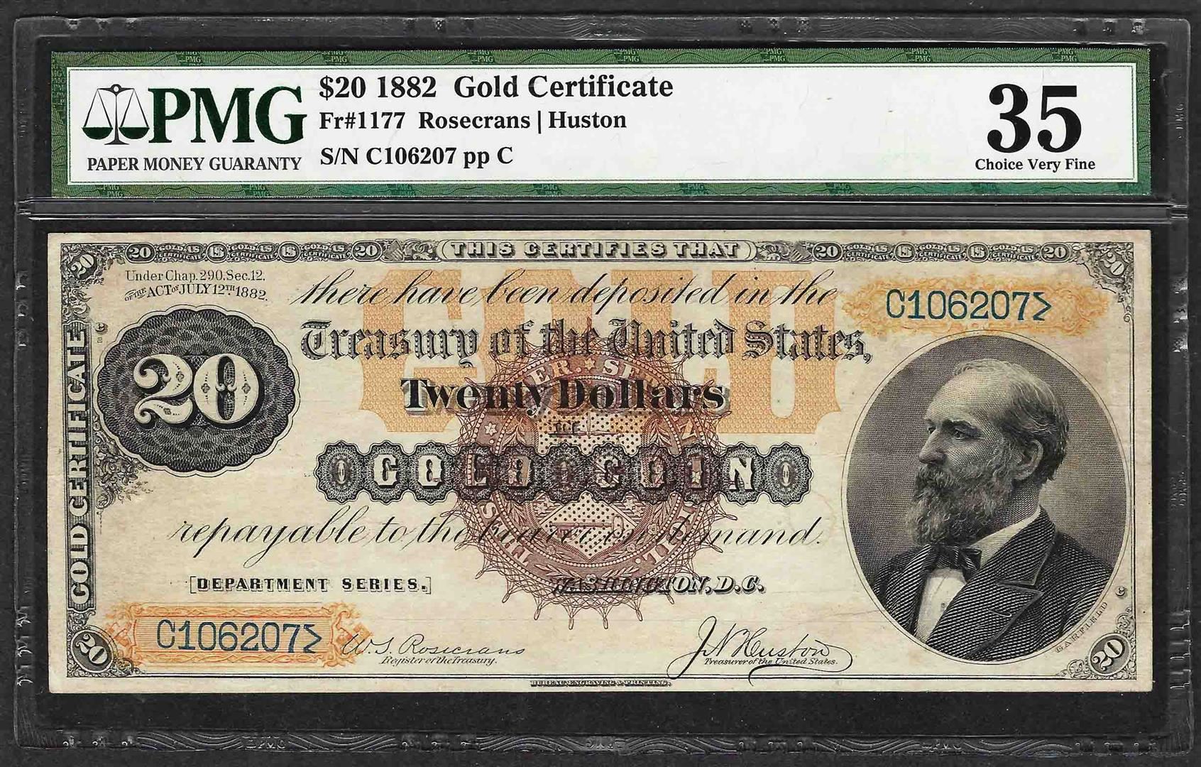 One 1882 $20 Gold Certificate Note Fr.1177 PMG Choice Very Fine 35. PMG has noted "Great Color & Margins" which is understandable being that the color on the reverse of this note is outstanding! PMG has graded a single Uncirculated example with the next highest note a single XF and then this 35. This is sure to be one of the many highlights of the auction. PMG Certified.