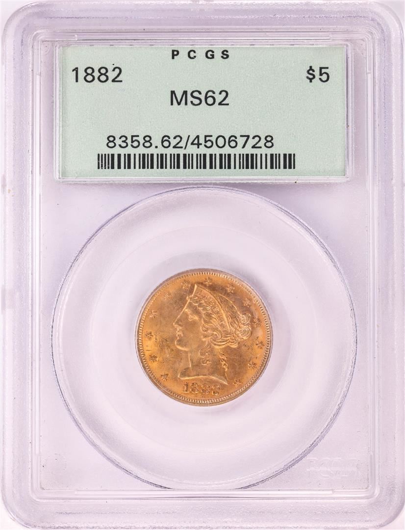 1882 $5 Liberty Head Half Eagle Gold Coin PCGS MS62 Old Green Holder