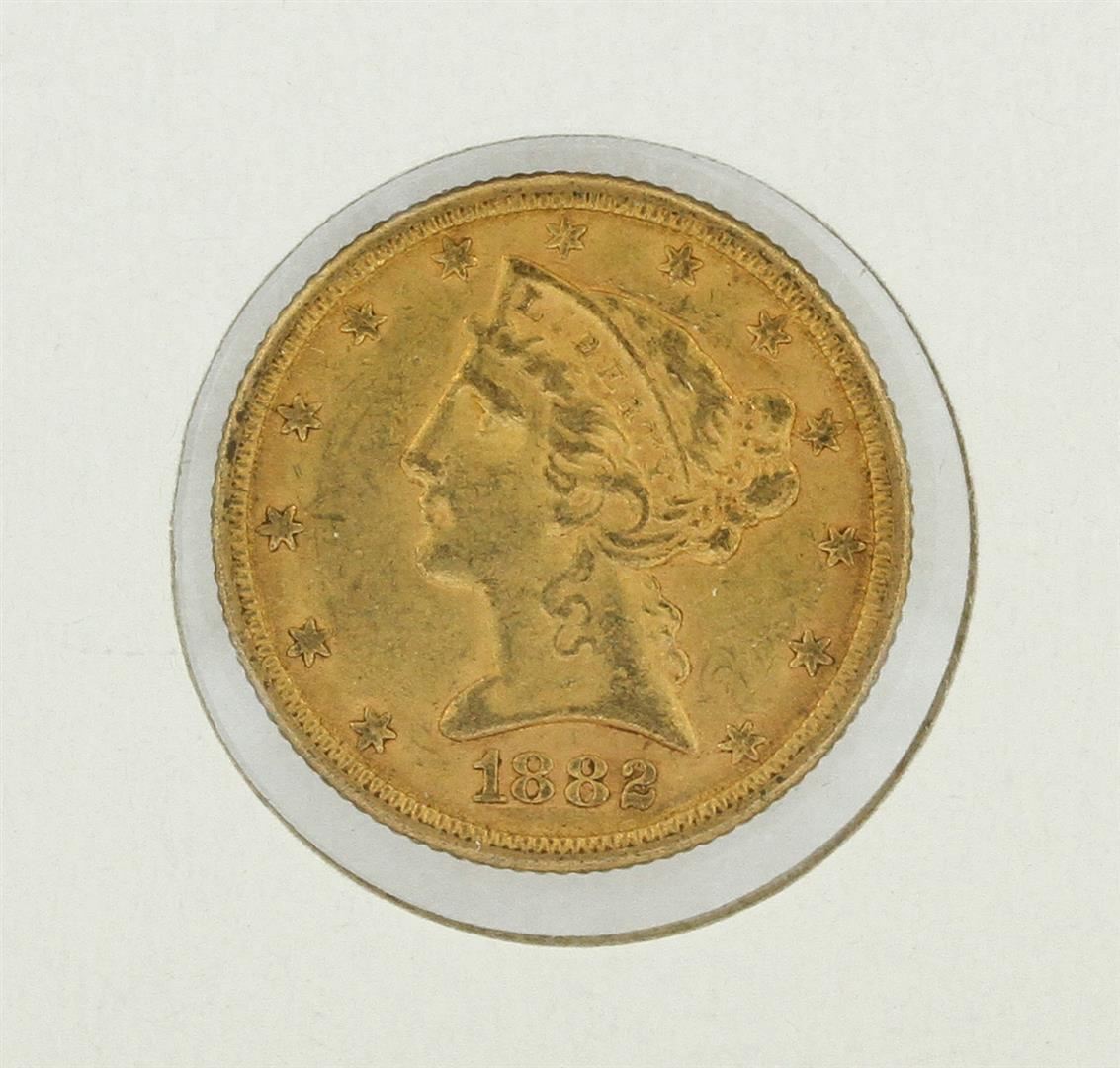 One 1882 $5 Liberty Head Half Eagle Gold Coin.