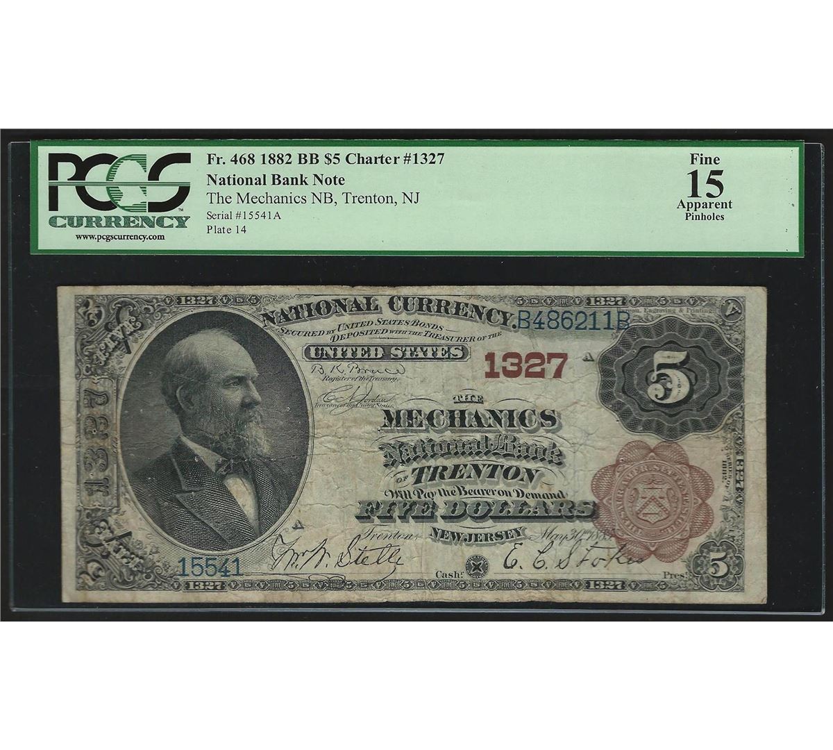 One 1882 $5 Mechanics National Bank of Trenton New Jersey National Currency Note PCGS F15. PCGS Graded.