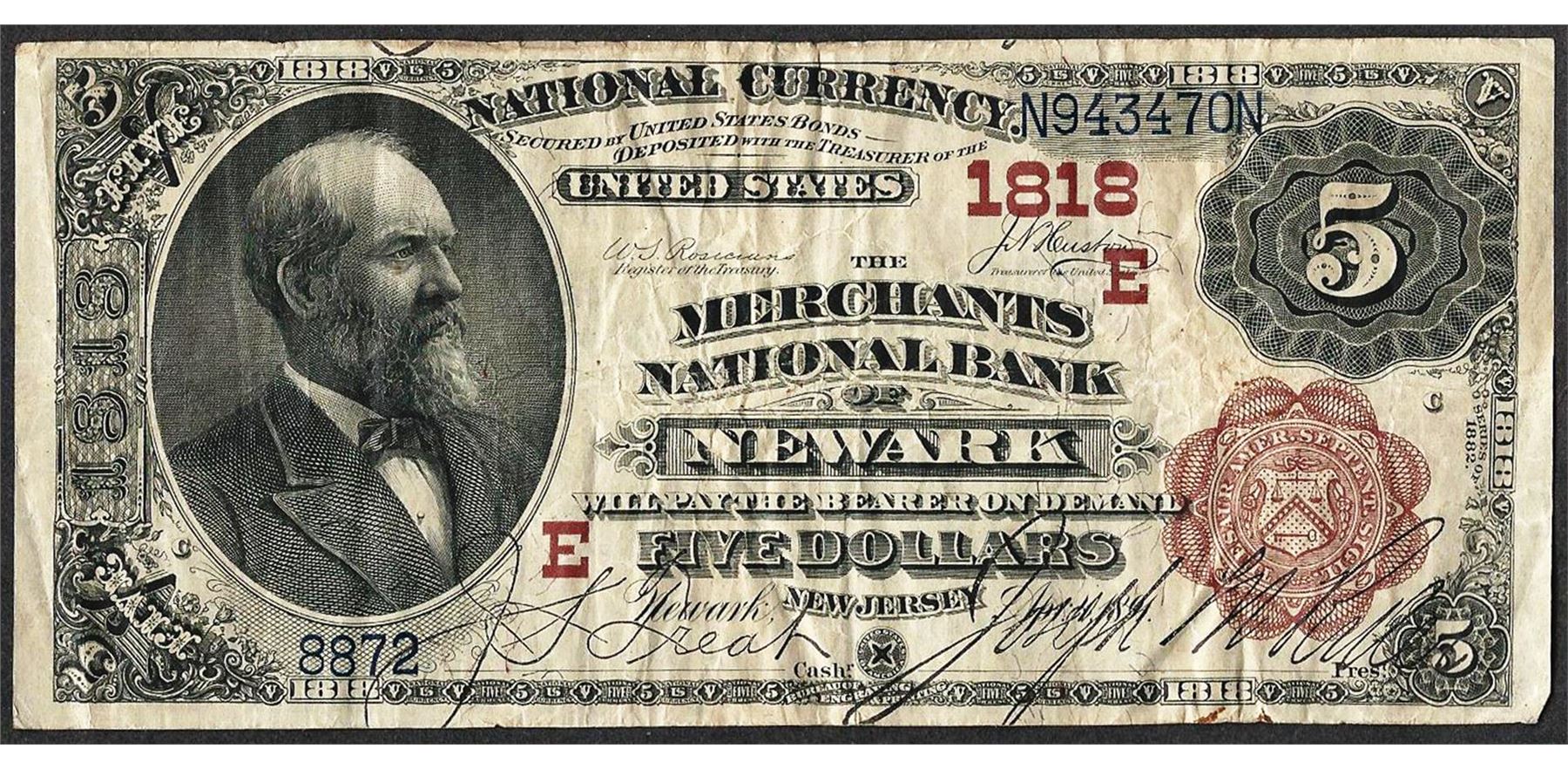 One 1882 BB $5 Merchants NB of Newark, NJ CH# 1818 National Currency Note.