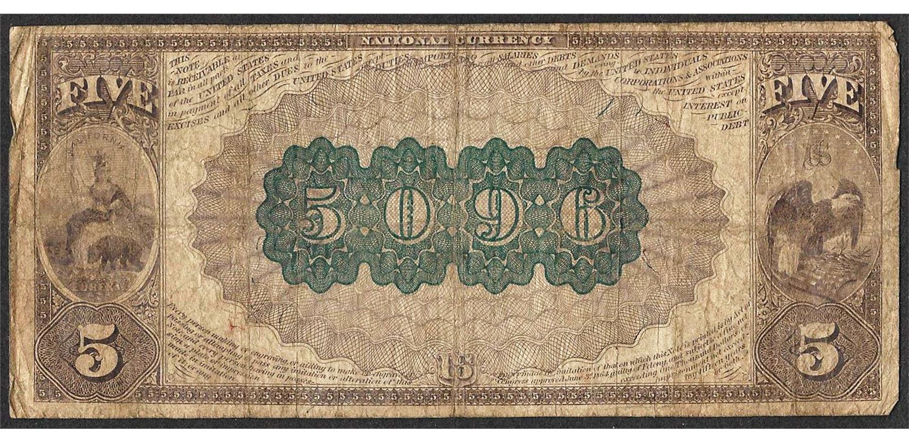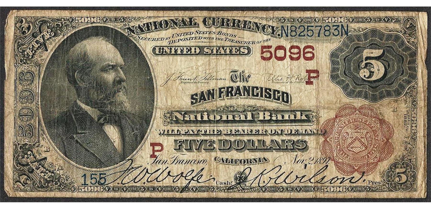 One 1882 BB $5 San Francisco National Bank CA CH# 5096 National Currency Note.