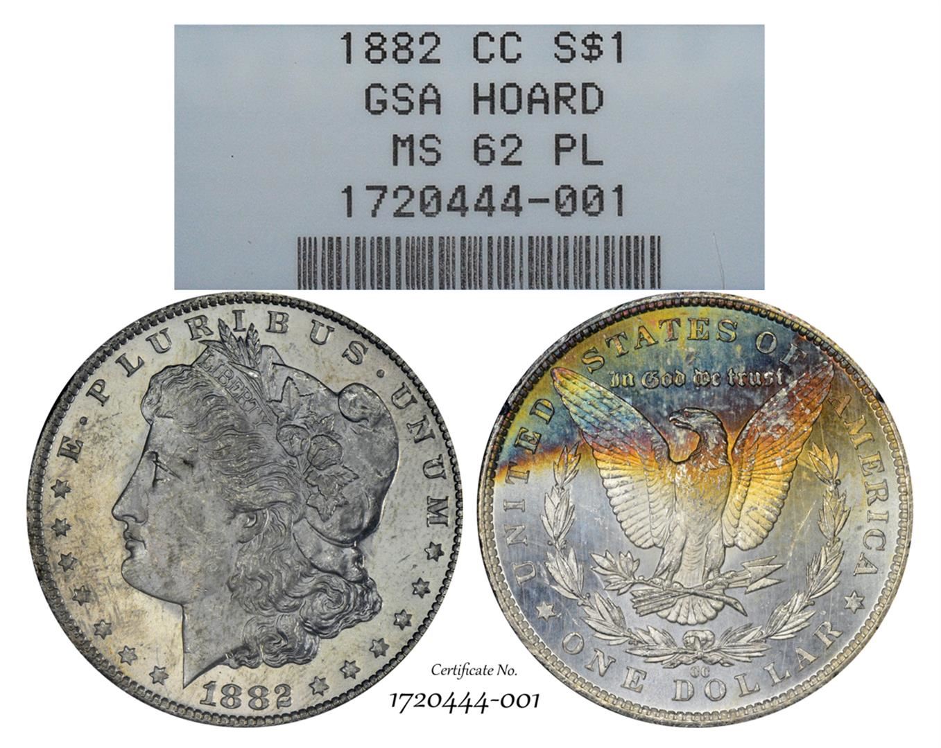 One 1882-CC $1 Morgan Silver Dollar Coin GSA Hoard NGC MS62 Proof Like Amazing Toning. NGC Certified.