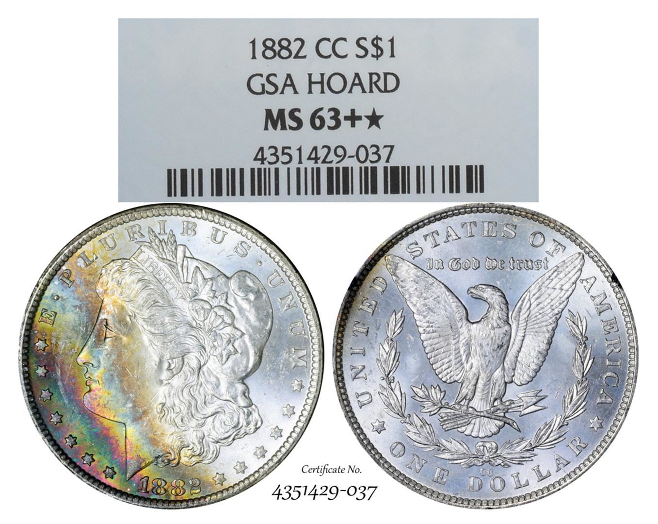 One 1882-CC $1 Morgan Silver Dollar Coin GSA Hoard NGC MS63+ Star Amazing Toning. NGC Certified.