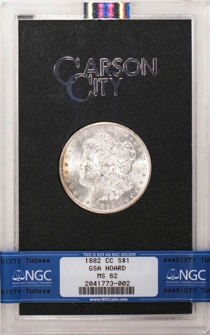 One 1882-CC $1 Morgan Silver Dollar Coin GSA Hoard Uncirculated NGC MS62 w/Box & COA. NGC Certified.