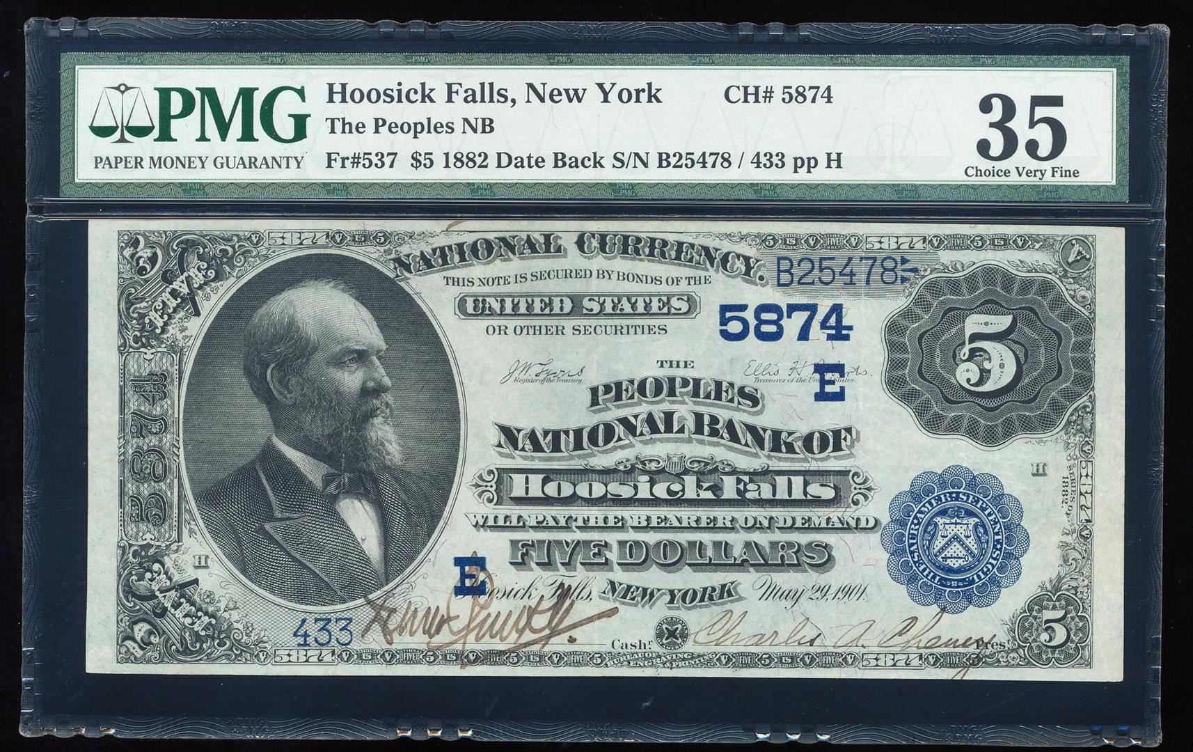 One 1882 Date Back $5 Hoosick Falls, NY CH# 5874 National Note PMG Choice Very Fine 35. PMG Certified.