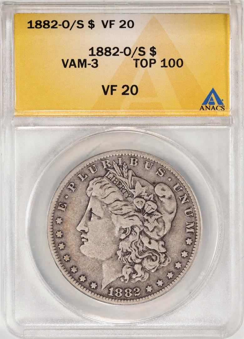 One 1882-O/S VAM-3 Top 100 $1 Morgan Silver Dollar Coin ANACS VF20. ANACS Certified.