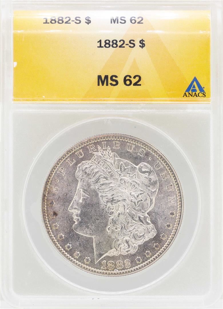One 1882-S $1 Morgan Silver Dollar Coin ANACS MS62. ANACS Certified.