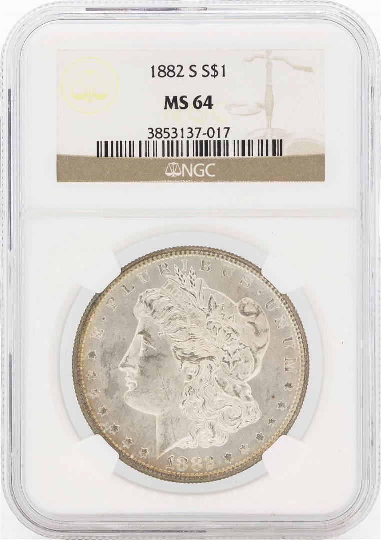 One 1882-S $1 Morgan Silver Dollar Coin NGC MS64. NGC Certified.