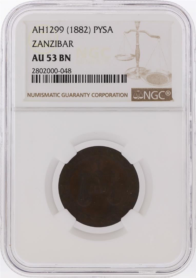 One 1882 Zanzibar Pysa Coin NGC Graded AU53 BN. NGC Certified.