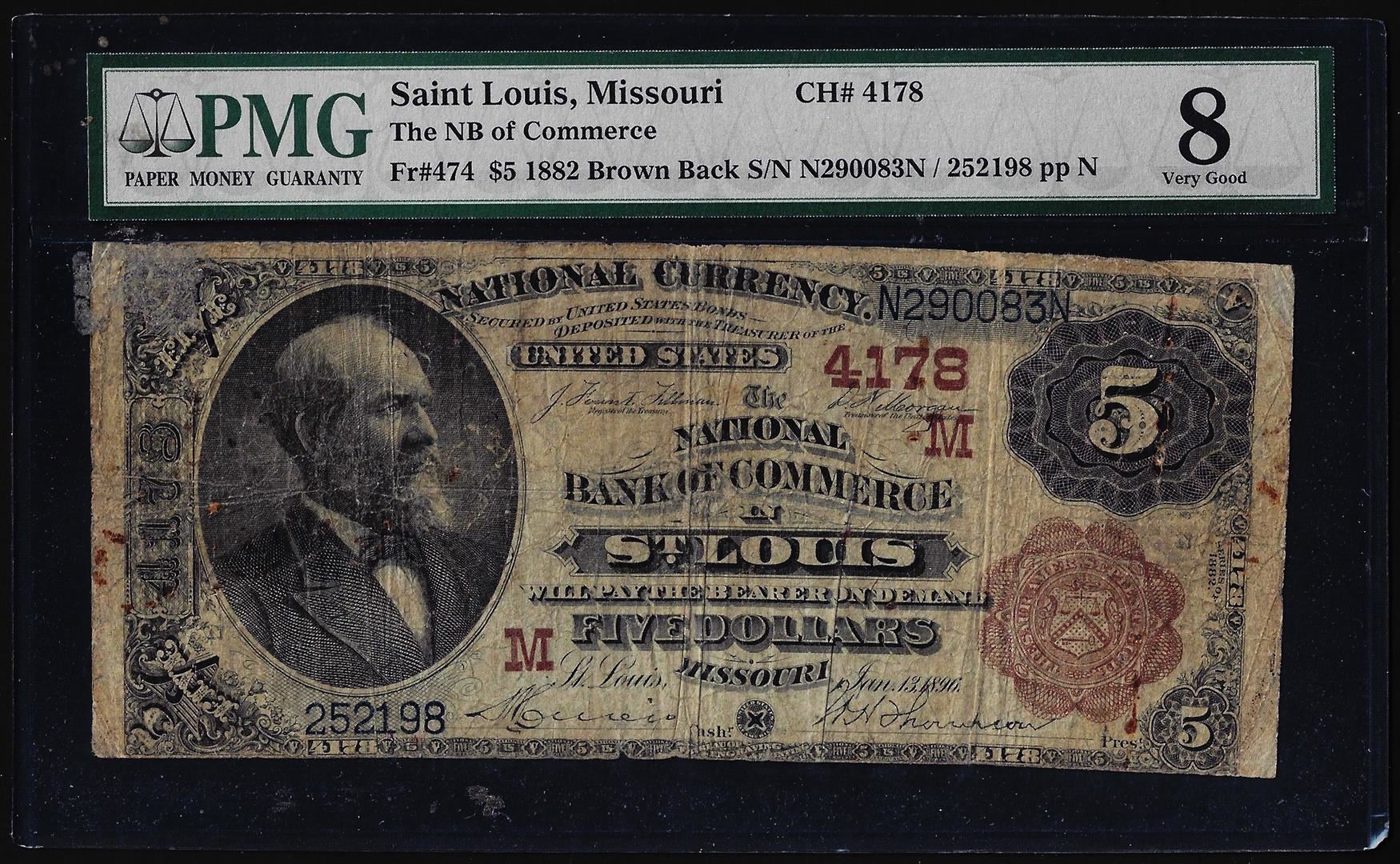 One 1882BB $5 Bank of Commerce St. Louis, MO CH# 4178 National Currency Note PMG Very Good 8. PMG Certified.