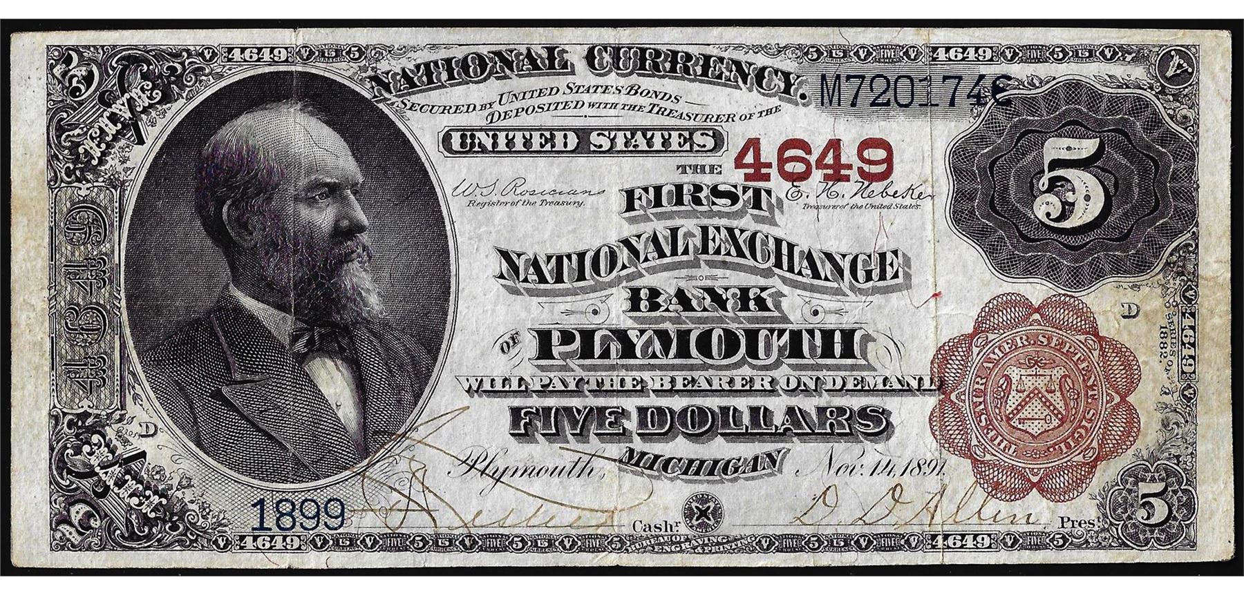 One 1882BB $5 First National Exchange Bank of Plymouth, MI CH# 4649 National Currency Note.