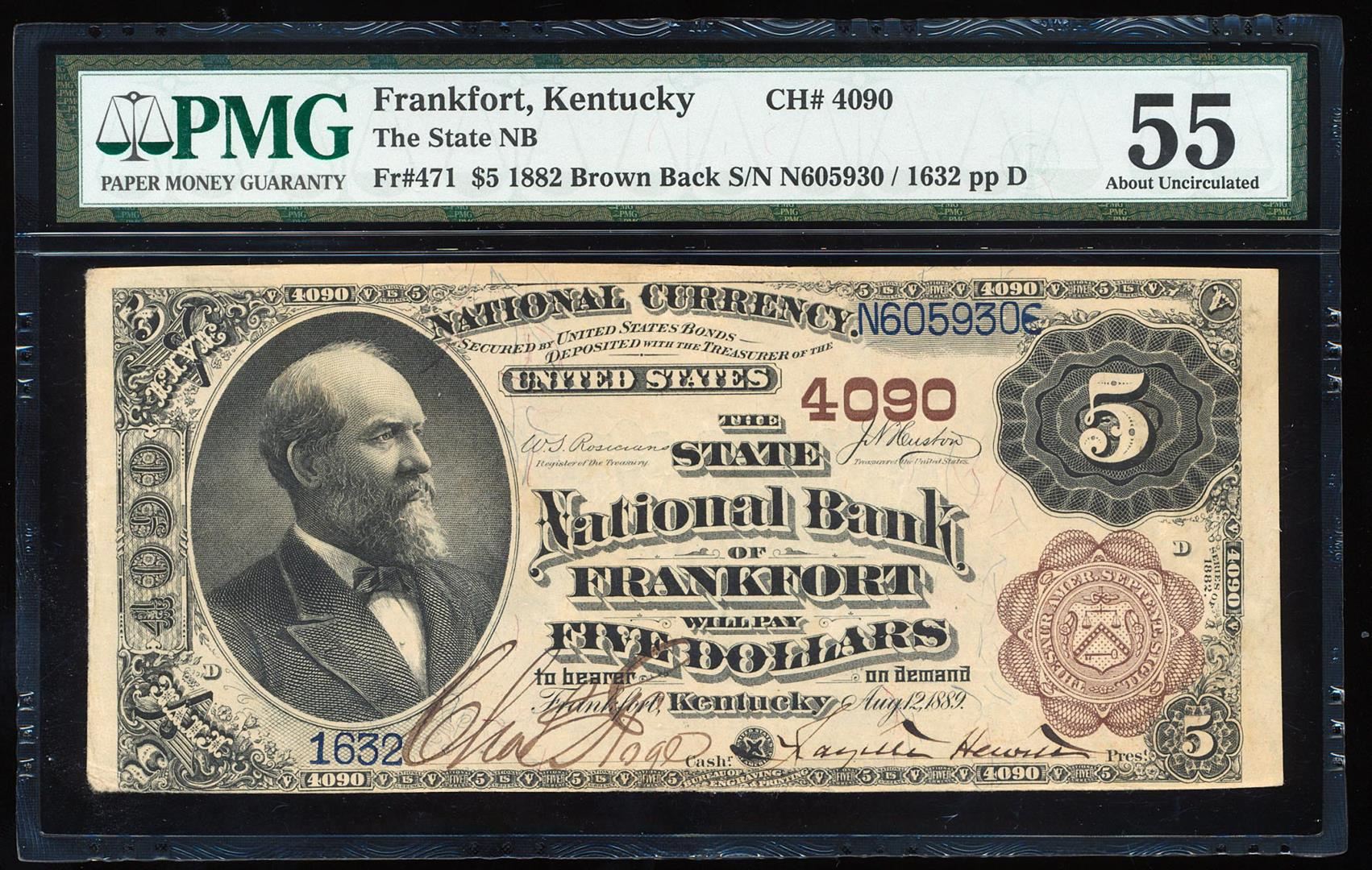 One 1882BB $5 Frankfort, KY CH# 4090 National Note PMG About Uncirculated 55. PMG Certified.