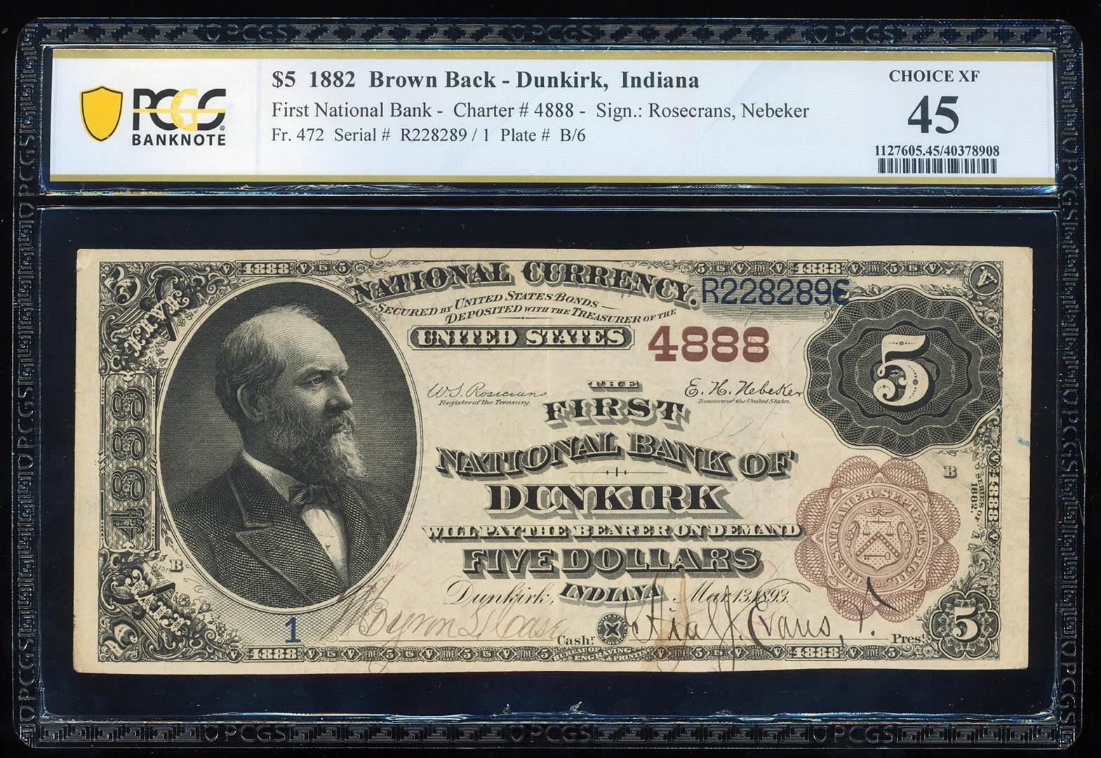One 1882BB $5 NB of Dunkirk, IN CH# 4888 National Bank Note PCGS Choice Extremely Fine 45. PCGS Graded.