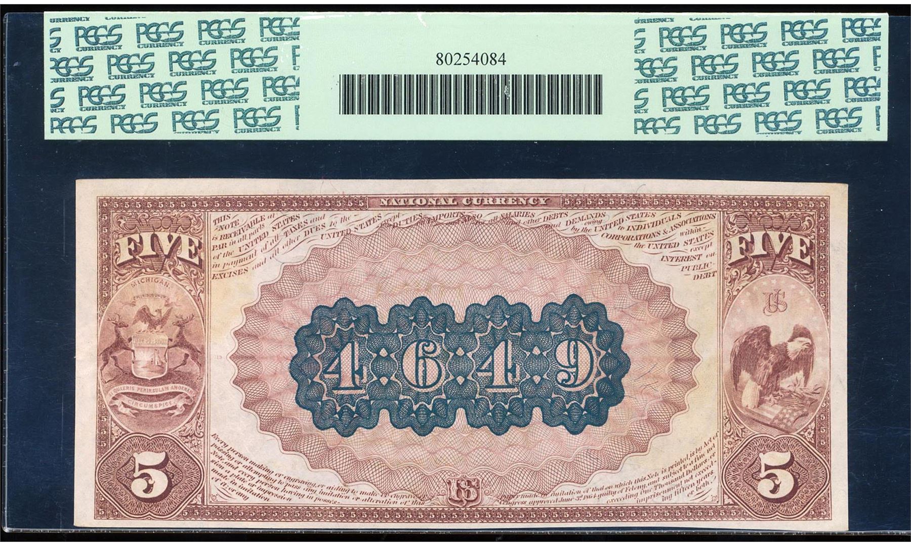 1882BB $5 Plymouth, MI CH# 4649 National Bank Note PCGS Gem New 65PPQ