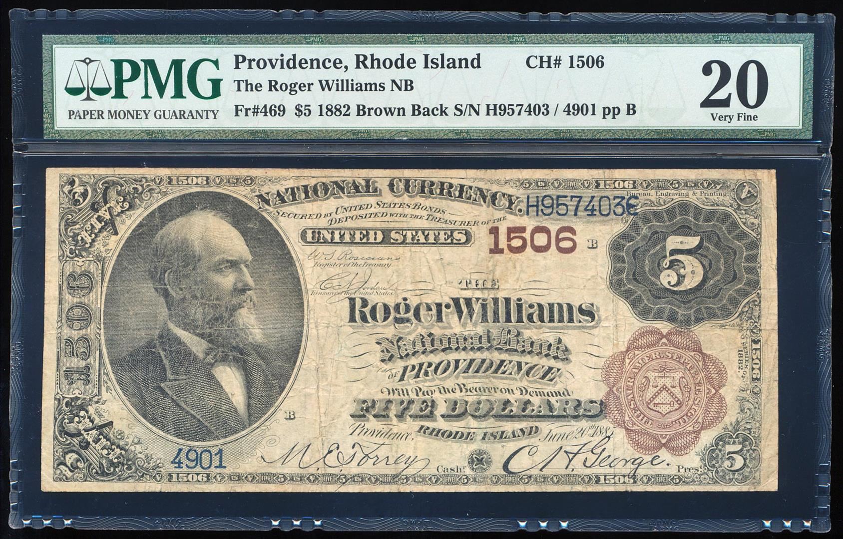 1882BB $5 Roger Williams NB Providence, RI CH# 1506 National Note PMG Very Fine 20