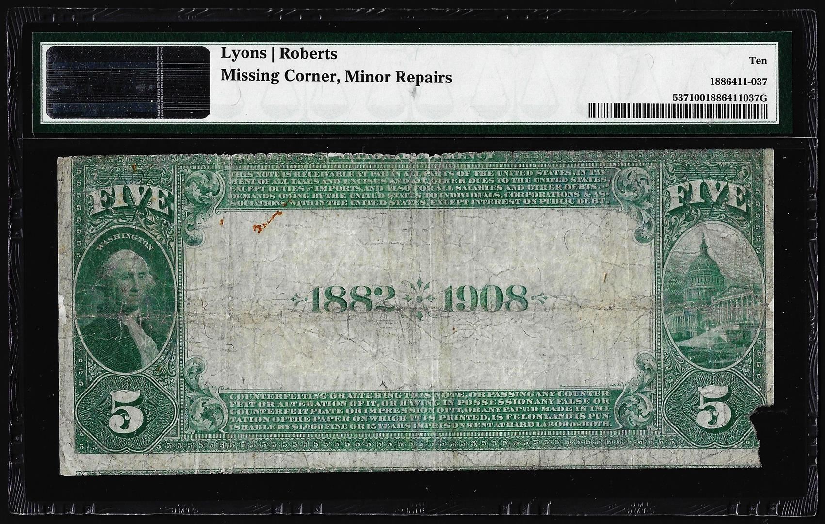 One 1882DB $5 Honolulu, Territory of Hawaii Ch# 5550 National Note PMG Very Good 10. PMG Certified.