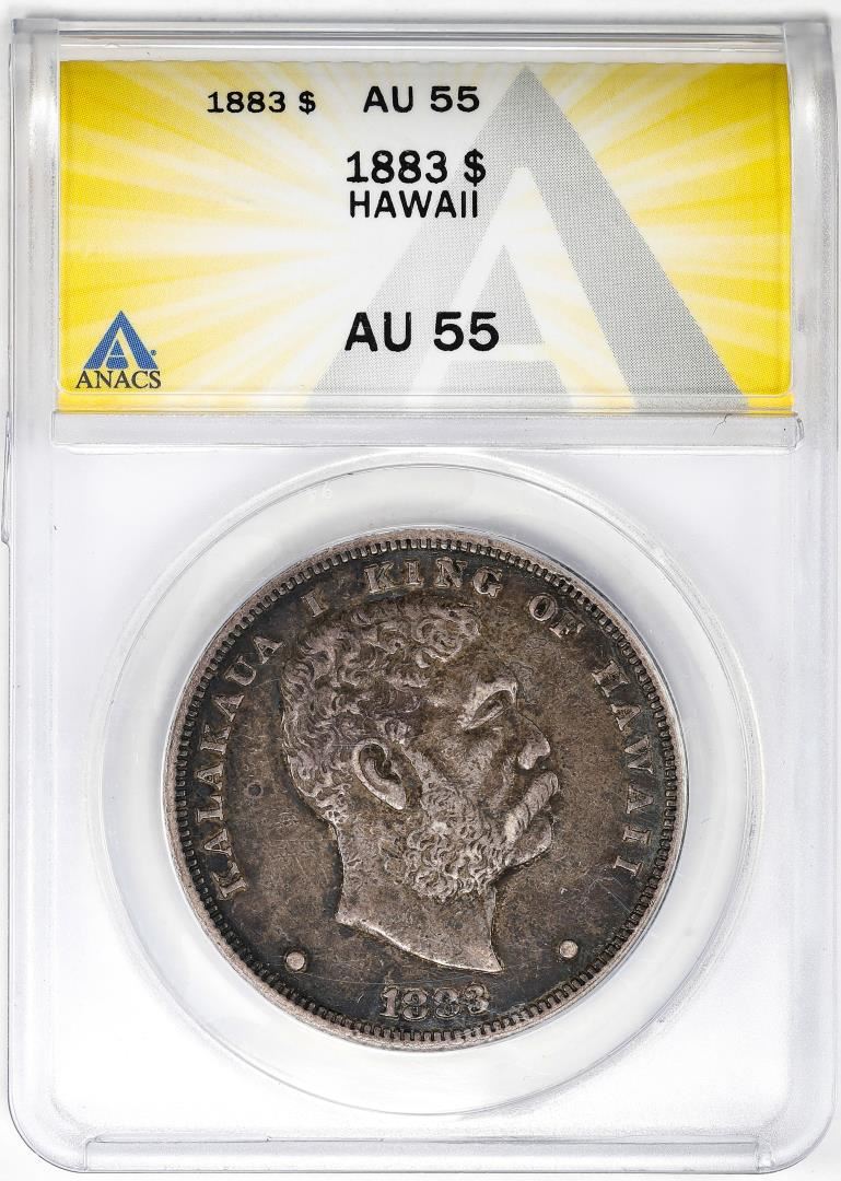 One 1883 $1 Kingdom of Hawaii Dollar Coin ANACS AU55. ANACS Certified.