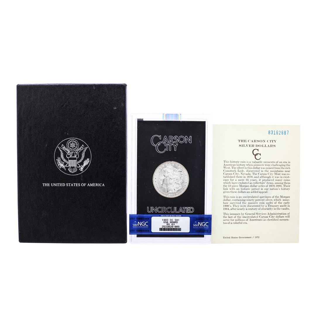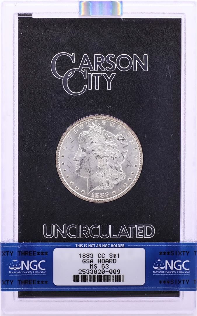 One 1883-CC $1 Morgan Silver Dollar Coin GSA Hoard NGC MS63 w/Box & COA. NGC Certified.