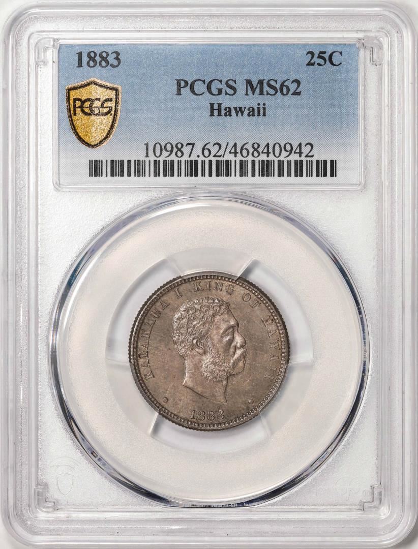 One 1883 Kingdom of Hawaii Quarter Coin PCGS MS62. PCGS Graded.