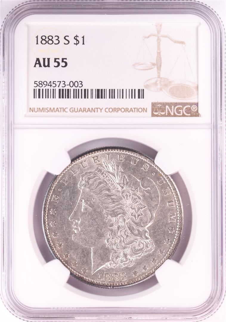 One 1883-S $1 Morgan Silver Dollar Coin NGC AU55. NGC Certified.