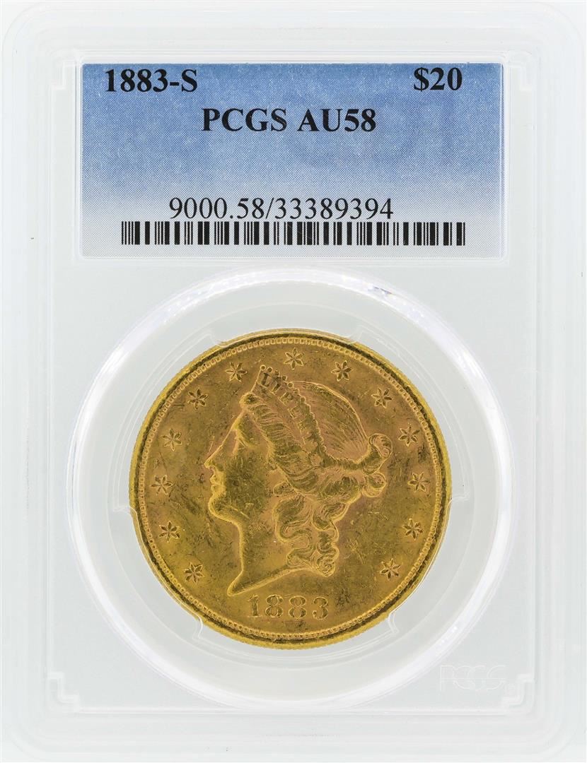 One 1883-S $20 Liberty Head Double Eagle Gold Coin PCGS AU58. PCGS Graded.