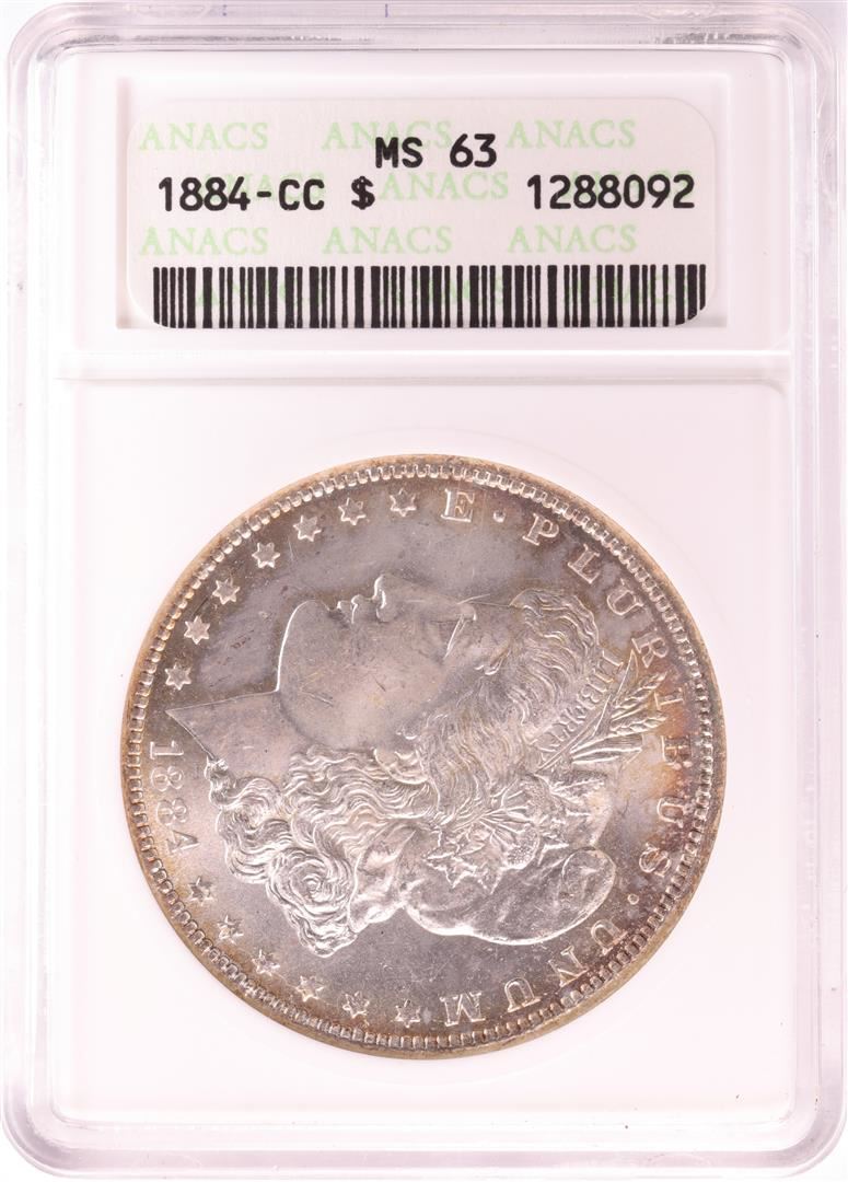 One 1884-CC $1 Morgan Silver Dollar Coin ANACS MS63. ANACS Certified.