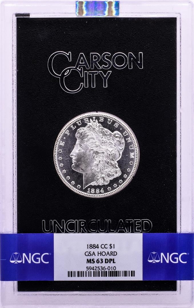 One 1884-CC $1 Morgan Silver Dollar Coin GSA Hoard NGC MS63 DPL w/Box & COA. NGC Certified.