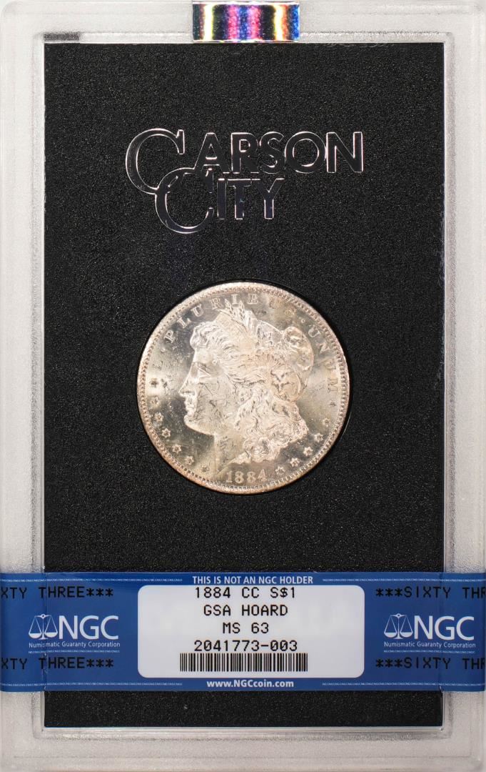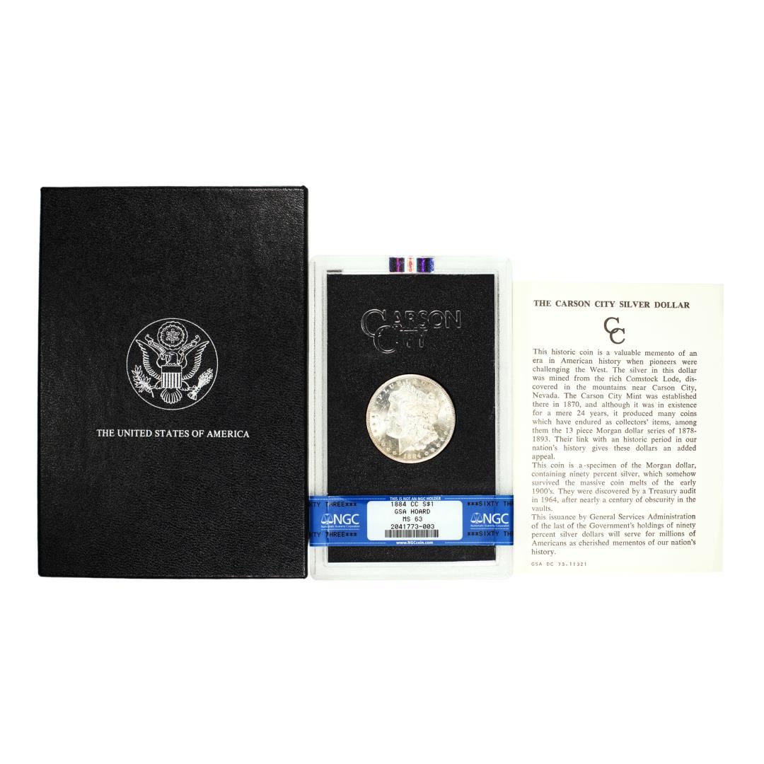 One 1884-CC $1 Morgan Silver Dollar Coin GSA Hoard Uncirculated NGC MS63 w/Box & COA. NGC Certified.