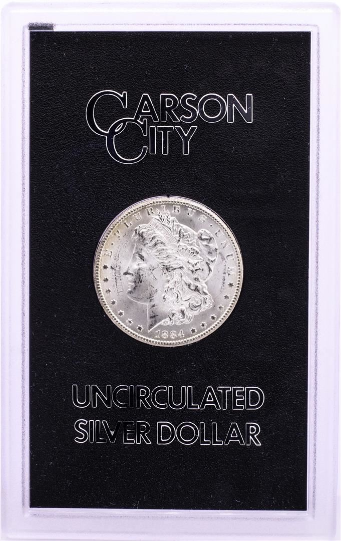 One 1884-CC $1 Morgan Silver Dollar Coin GSA Hoard Uncirculated w/Box & COA.